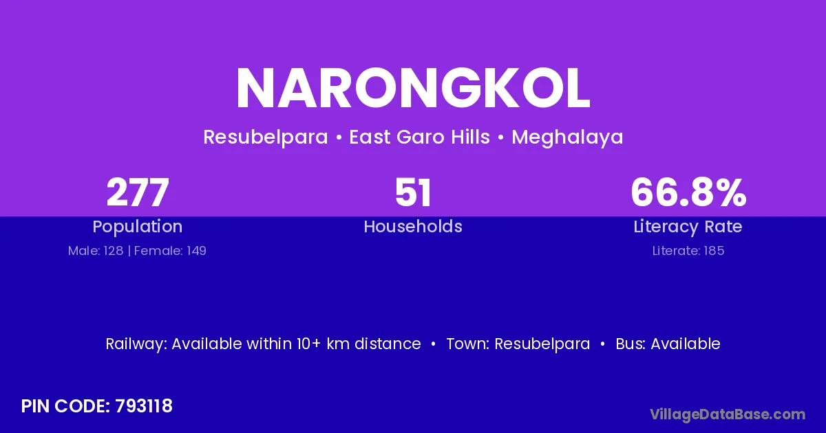 Narongkol village is located in the Resubelpara Subdivision of the East Garo Hills district in Meghalaya .