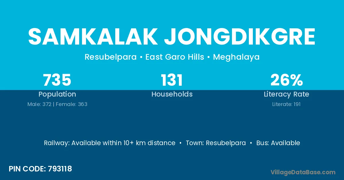 Resubelpara is the nearest town to Samkalak Jongdikgre village for major economic activities