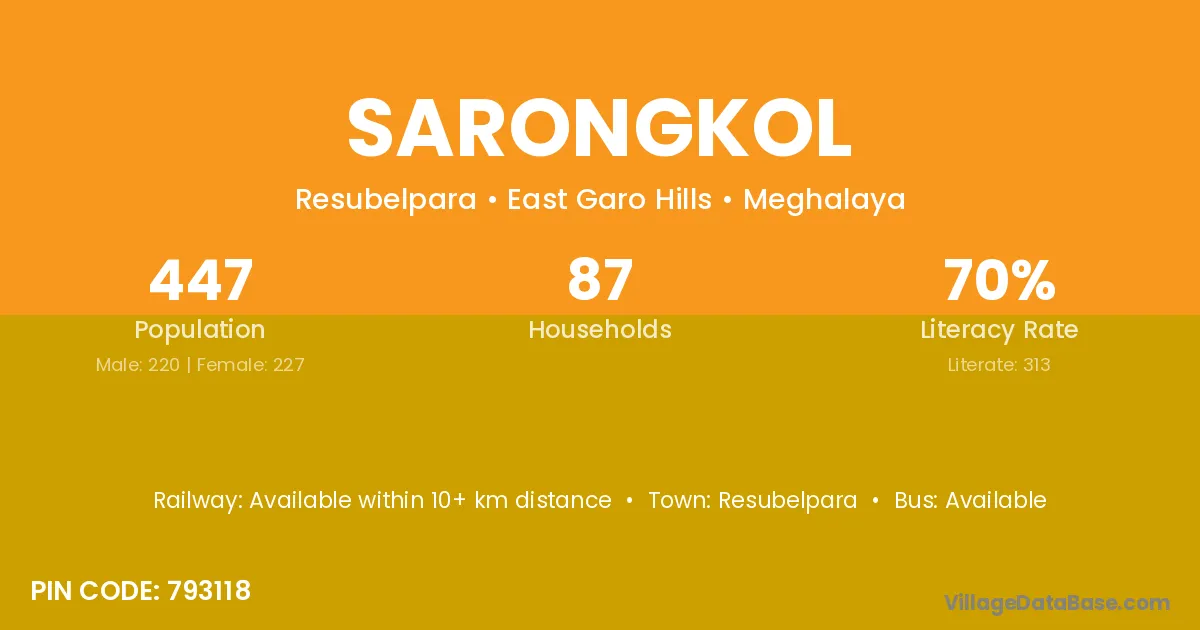 Sarongkol village has a total population of 447 people, of which 220 are males and 227 are females.