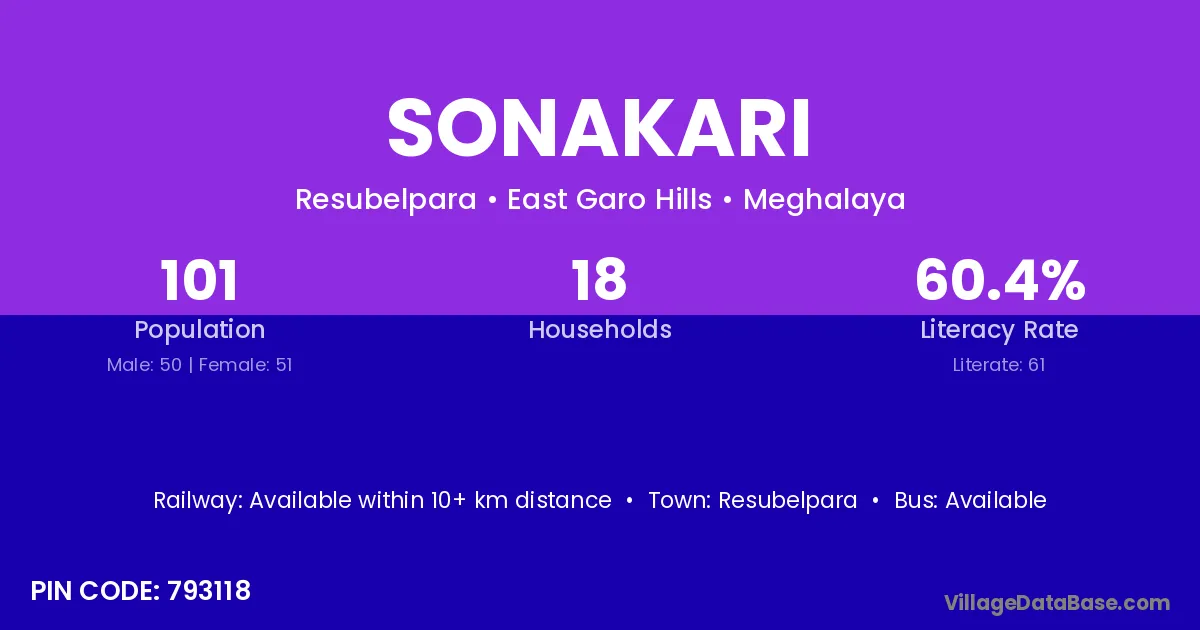 Sonakari village has a total population of 101 people, of which 50 are males and 51 are females.