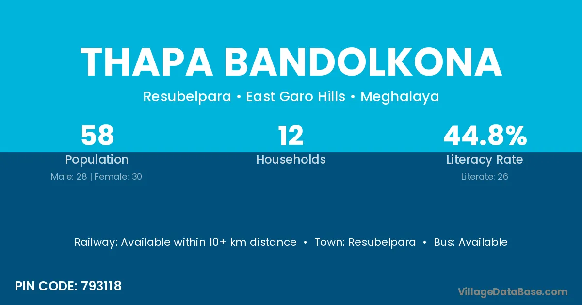 The literacy rate of Thapa Bandolkona village is 44.83%. Male literacy stands at 60.71% and female literacy at 30.00%.
