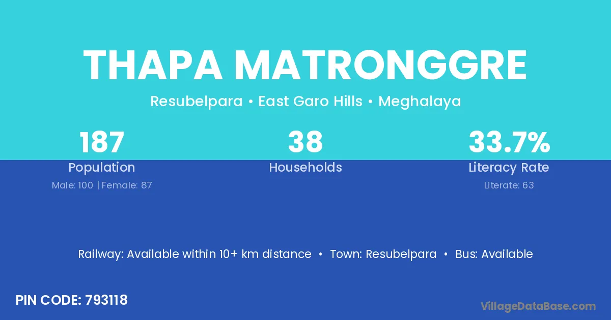 Thapa Matronggre village has a total population of 187 people, of which 100 are males and 87 are females.