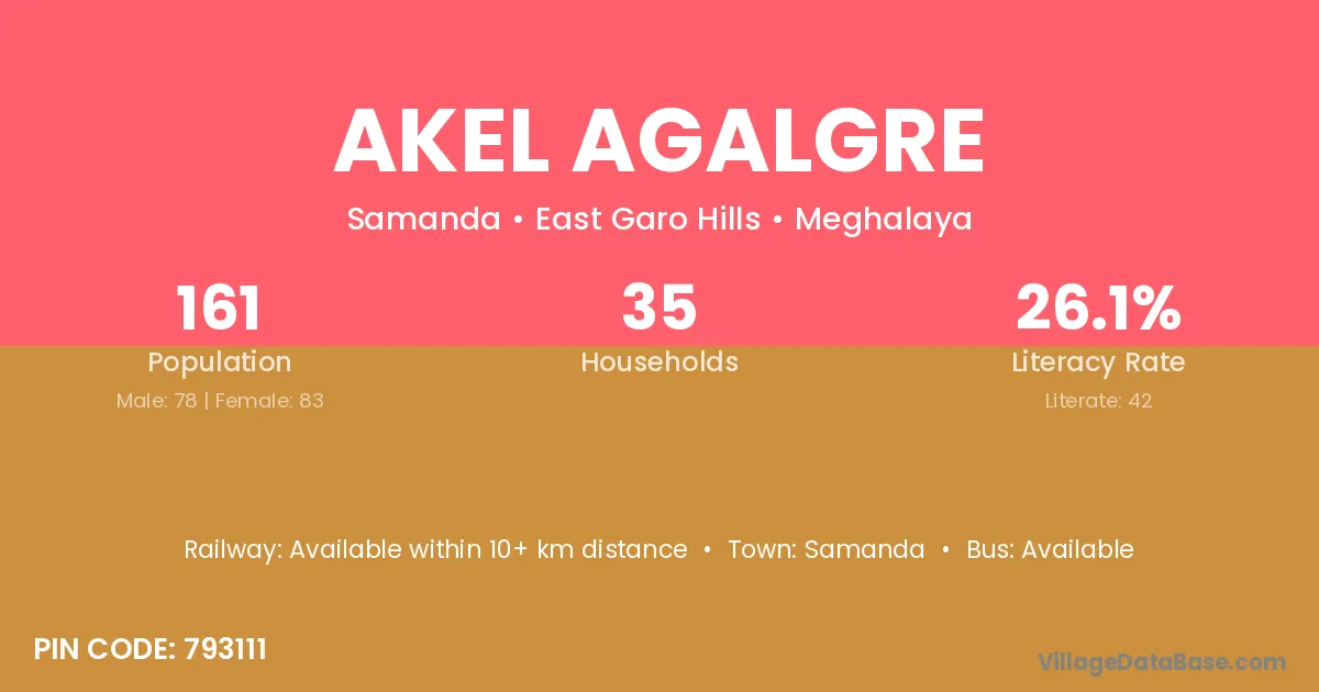 Akel Agalgre village has a total population of 161 people, of which 78 are males and 83 are females.