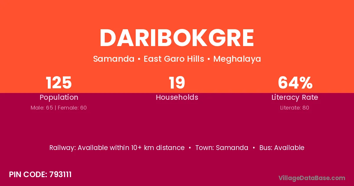 Daribokgre village has a total population of 125 people, of which 65 are males and 60 are females.