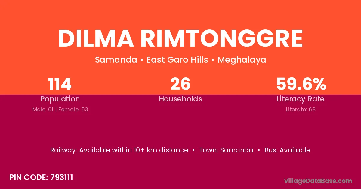 The literacy rate of Dilma Rimtonggre village is 59.65%. Male literacy stands at 57.38% and female literacy at 62.26%.
