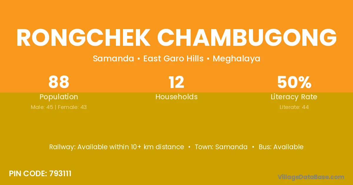 Rongchek Chambugong village has a total population of 88 people, of which 45 are males and 43 are females.