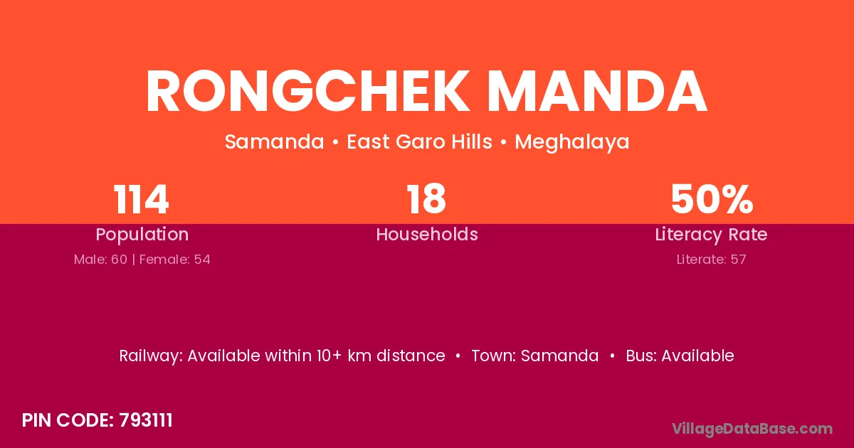 Rongchek Manda village has a total population of 114 people, of which 60 are males and 54 are females.
