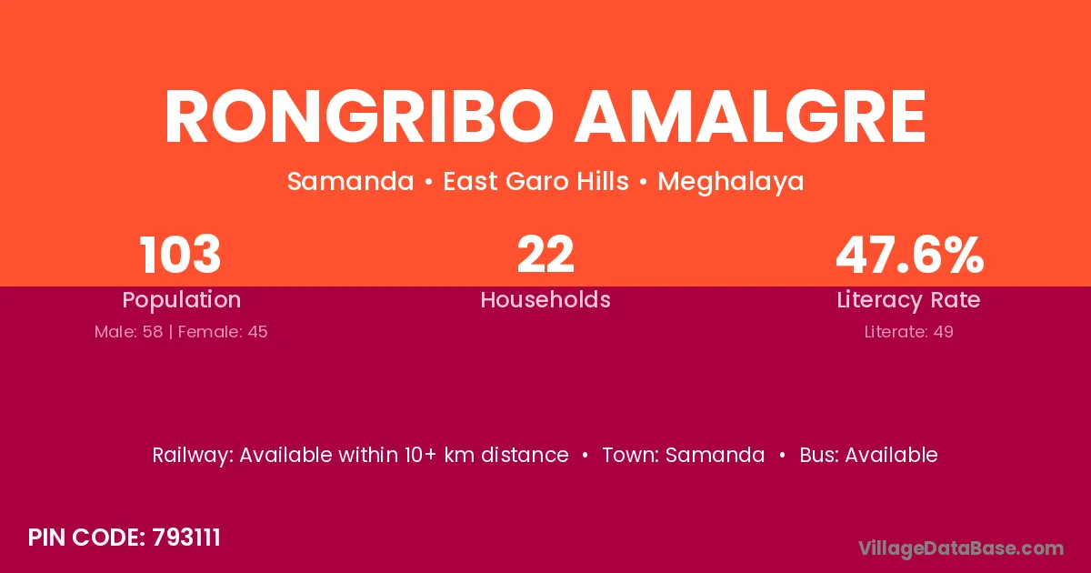 Rongribo Amalgre village has a total population of 103 people, of which 58 are males and 45 are females.