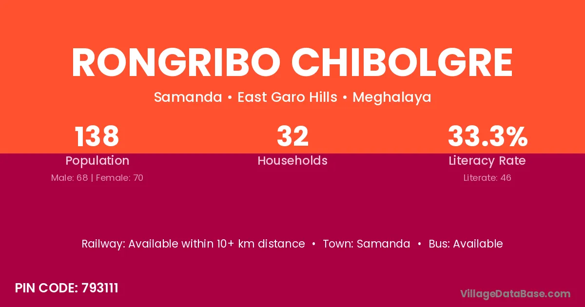 Rongribo Chibolgre village has a total population of 138 people, of which 68 are males and 70 are females.