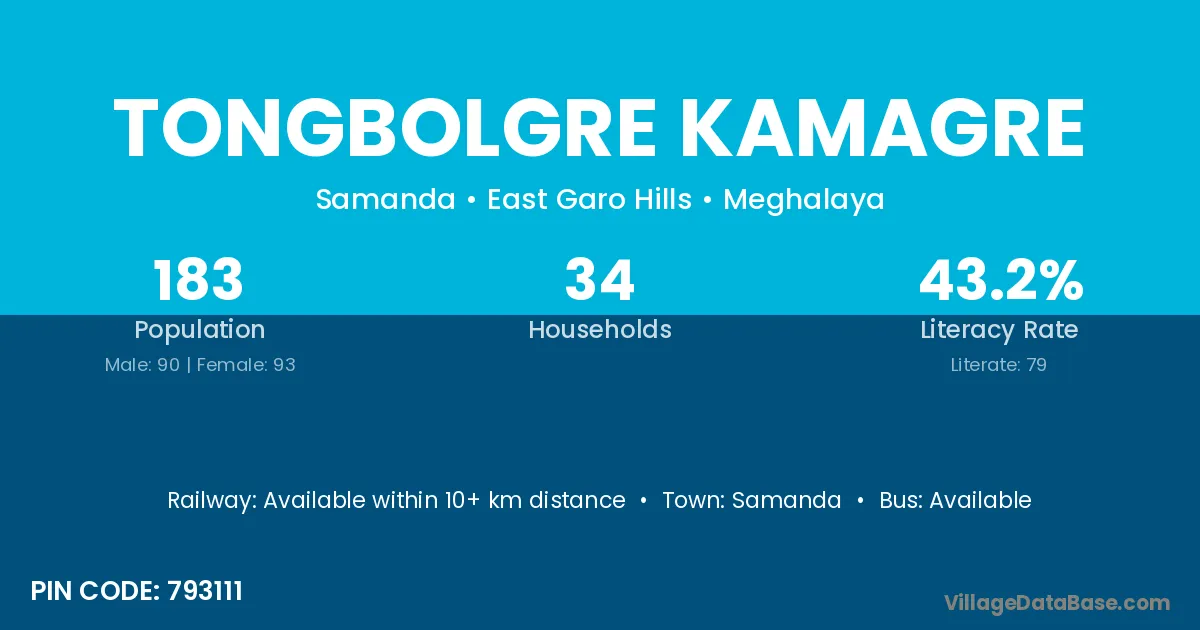 Tongbolgre Kamagre village has a total population of 183 people, of which 90 are males and 93 are females.