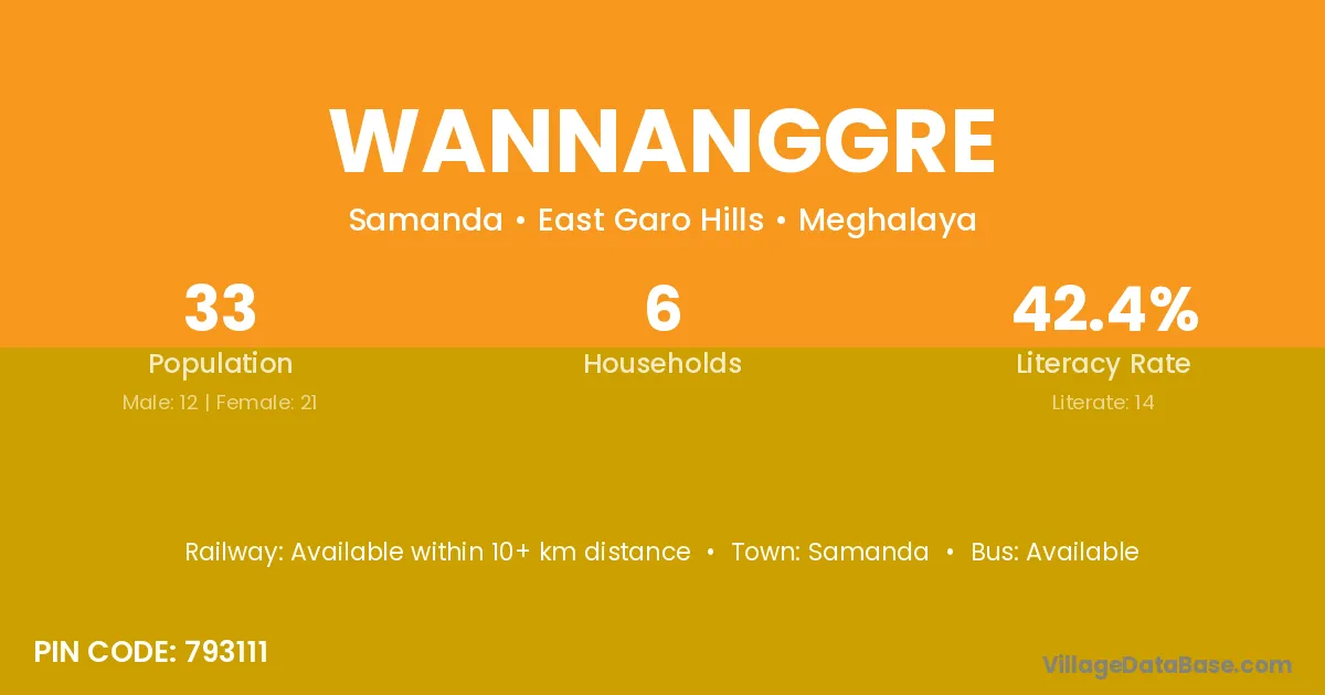 Wannanggre village has a total population of 33 people, of which 12 are males and 21 are females.