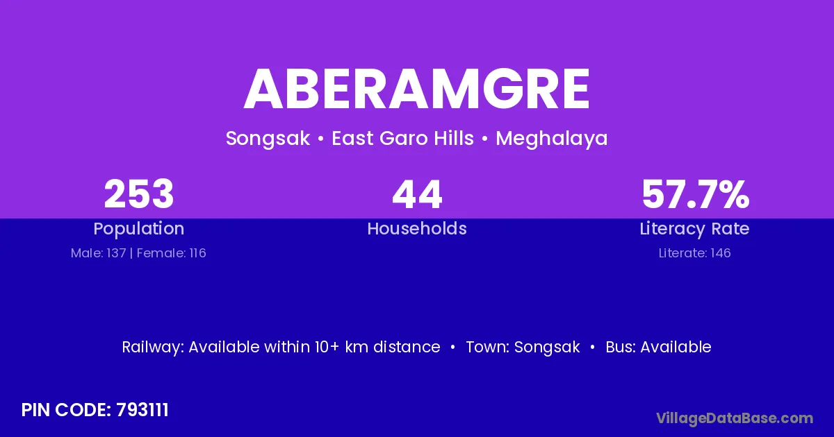 Aberamgre village is located in the Songsak Subdivision of the East Garo Hills district in Meghalaya .