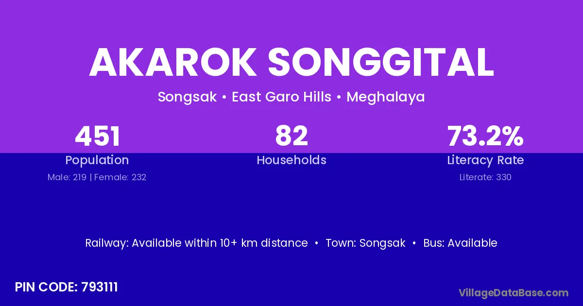 Akarok Songgital village has a total population of 451 people, of which 219 are males and 232 are females.