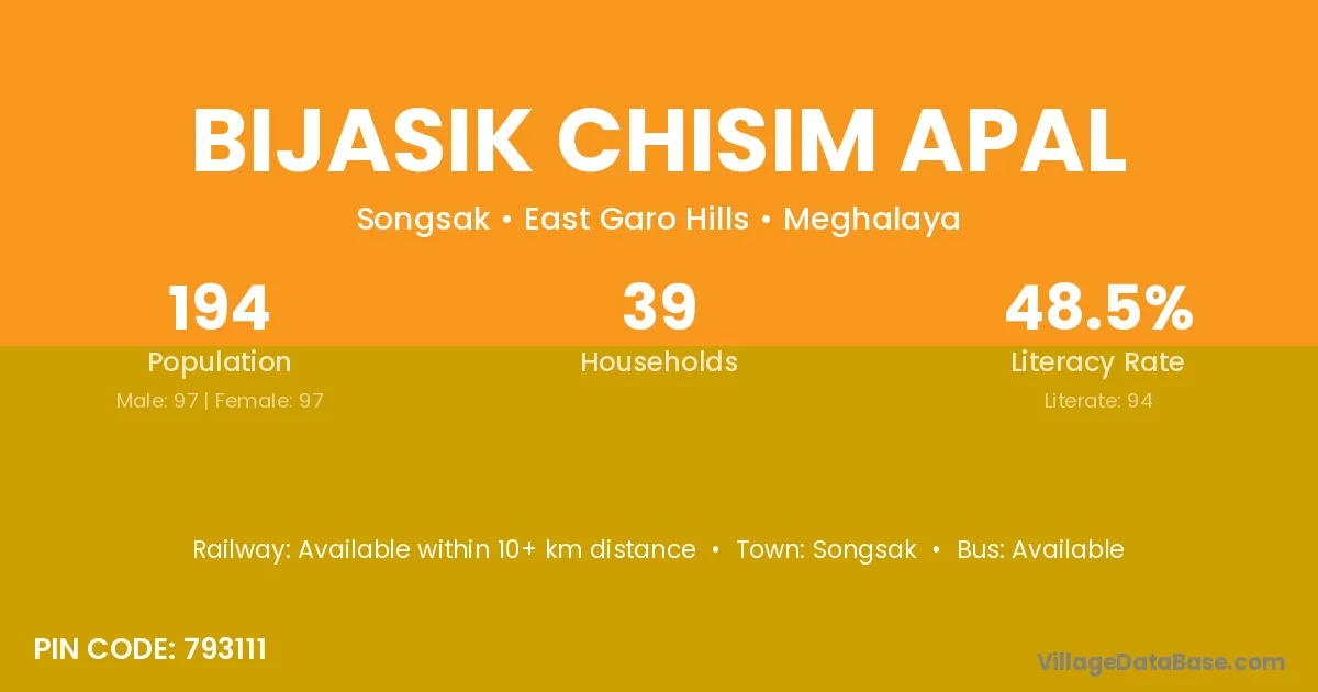 Bijasik Chisim Apal village has a total population of 194 people, of which 97 are males and 97 are females.