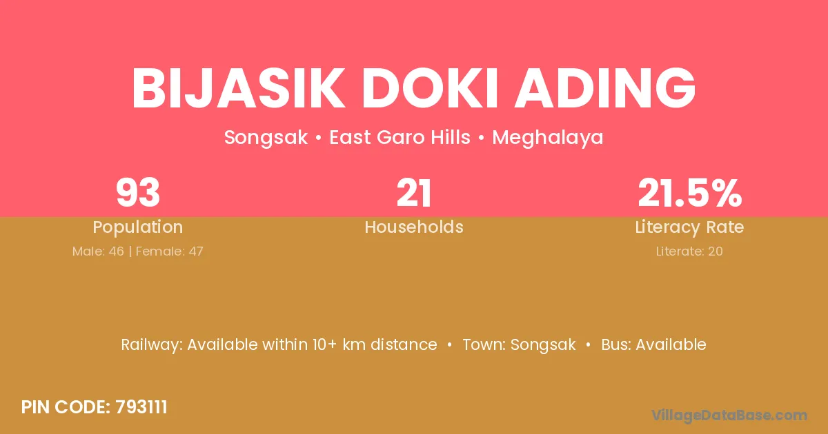 Bijasik Doki Ading village has a total population of 93 people, of which 46 are males and 47 are females.