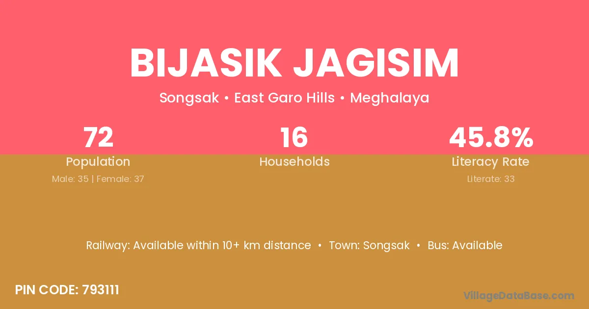 Bijasik Jagisim village has a total population of 72 people, of which 35 are males and 37 are females.