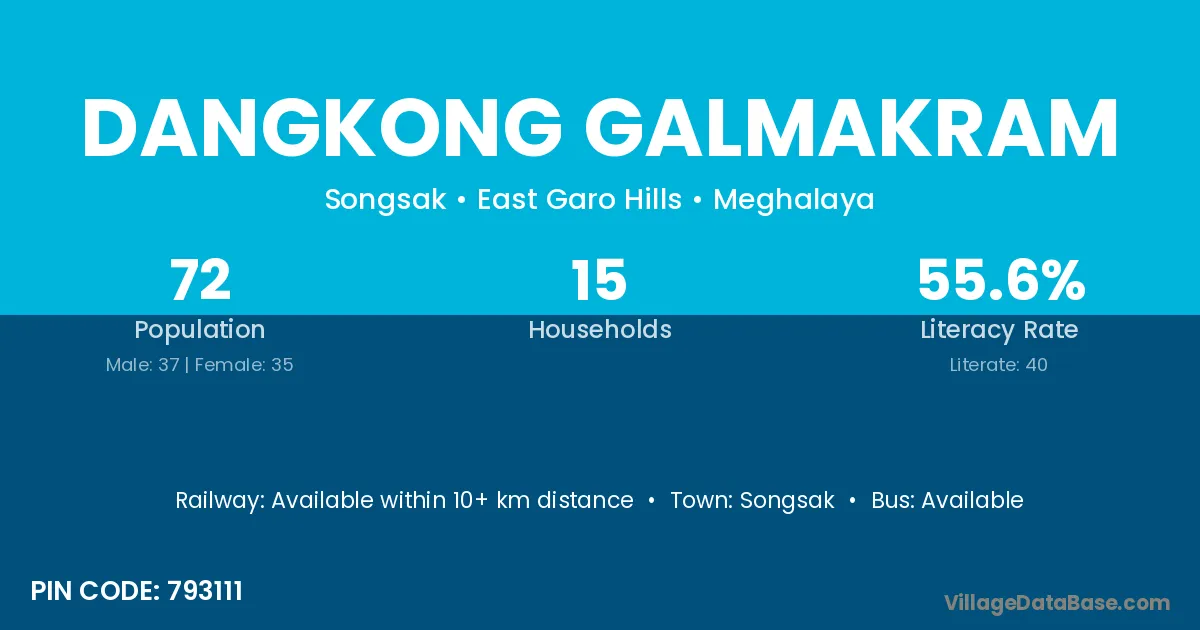 Dangkong Galmakram village has a total population of 72 people, of which 37 are males and 35 are females.