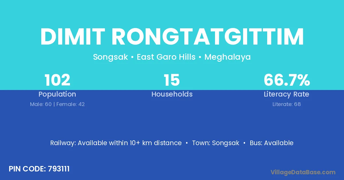 The literacy rate of Dimit Rongtatgittim village is 66.67%. Male literacy stands at 66.67% and female literacy at 66.67%.