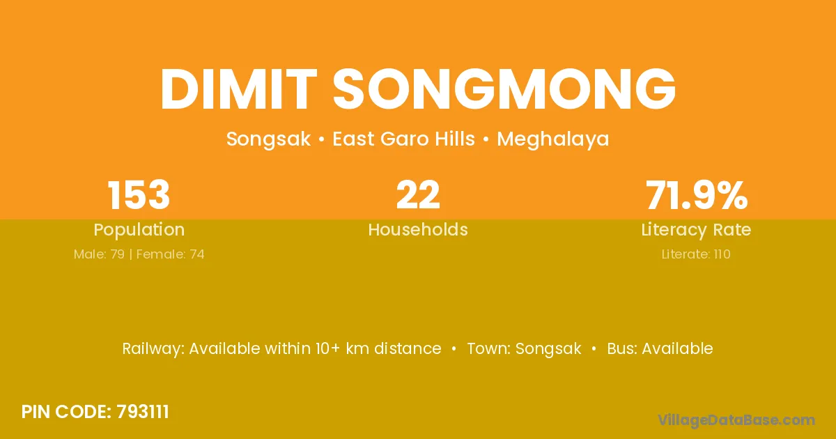 Dimit Songmong village has a total population of 153 people, of which 79 are males and 74 are females.