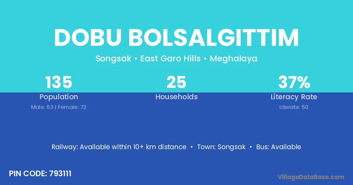 The literacy rate of Dobu Bolsalgittim village is 37.04%. Male literacy stands at 46.03% and female literacy at 29.17%.