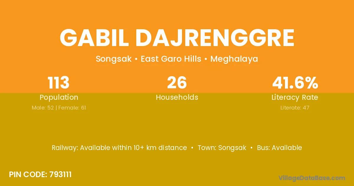Gabil Dajrenggre village has a total population of 113 people, of which 52 are males and 61 are females.