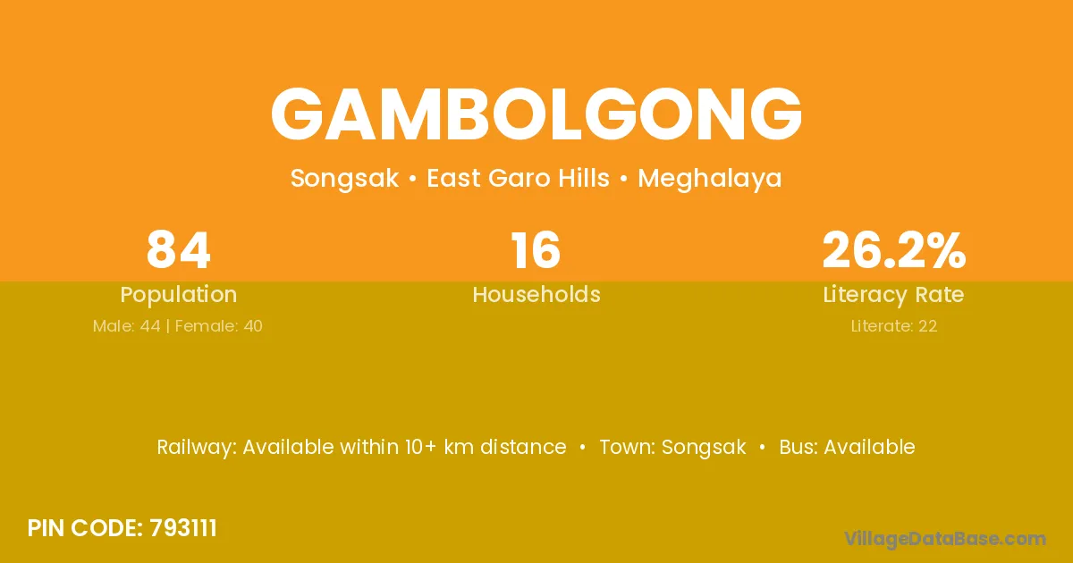 Gambolgong village has a total population of 84 people, of which 44 are males and 40 are females.