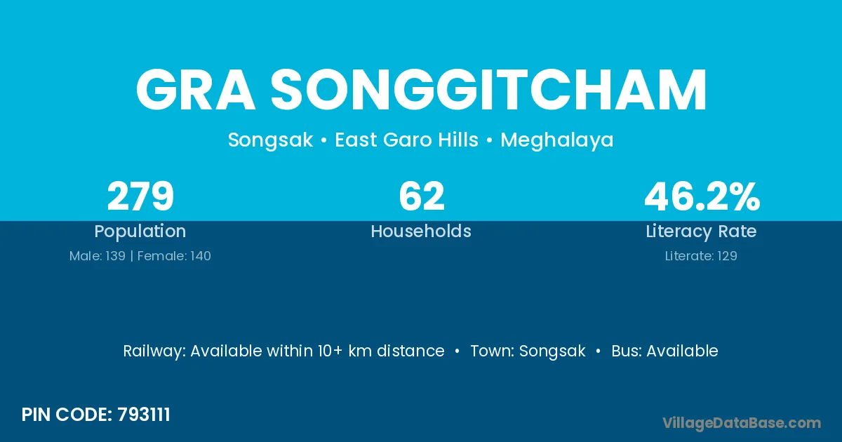 Gra Songgitcham village has a total population of 279 people, of which 139 are males and 140 are females.