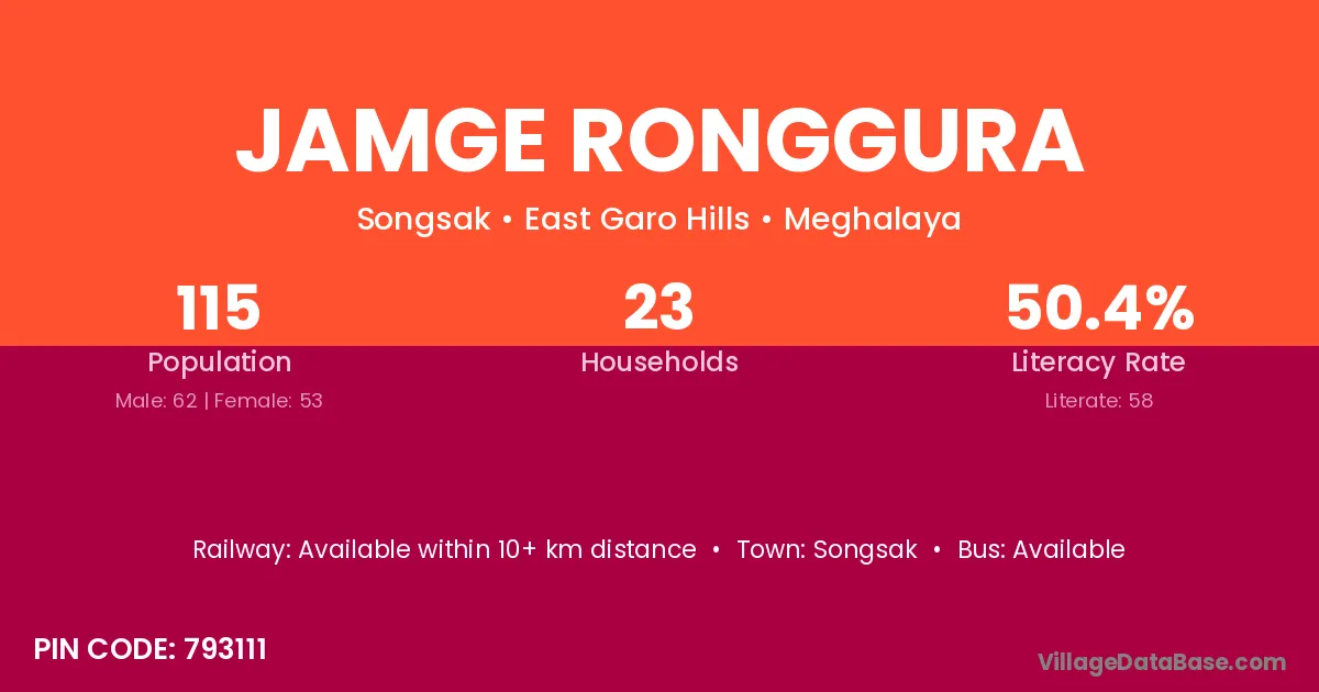 Jamge Ronggura village has a total population of 115 people, of which 62 are males and 53 are females.