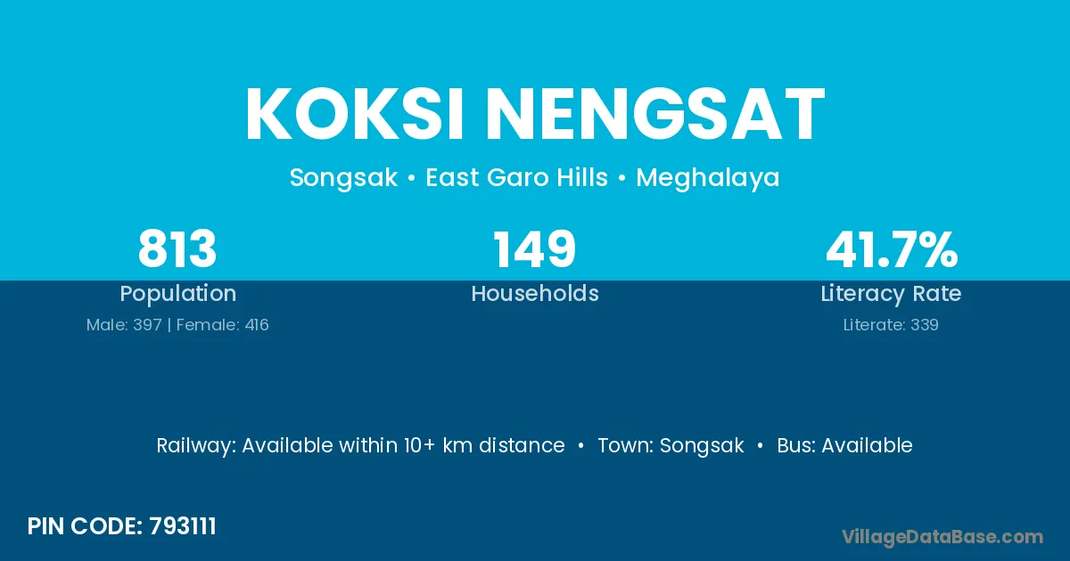 Koksi Nengsat village has a total population of 813 people, of which 397 are males and 416 are females.