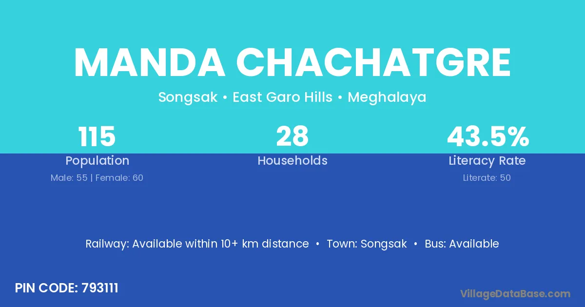 Manda Chachatgre village has a total population of 115 people, of which 55 are males and 60 are females.