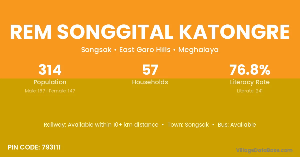 Rem Songgital Katongre village has a total population of 314 people, of which 167 are males and 147 are females.