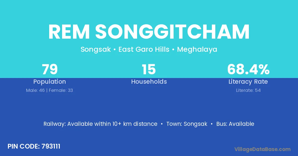 The literacy rate of Rem Songgitcham village is 68.35%. Male literacy stands at 67.39% and female literacy at 69.70%.