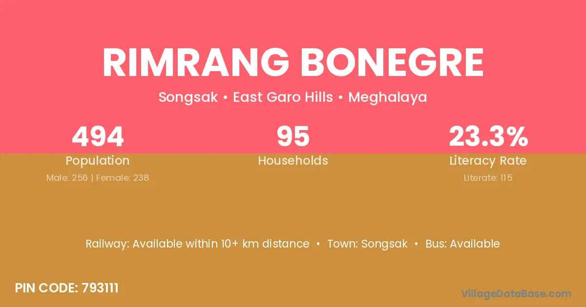Rimrang Bonegre village has a total population of 494 people, of which 256 are males and 238 are females.