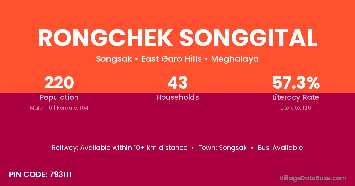 Rongchek Songgital village has a total population of 220 people, of which 116 are males and 104 are females.