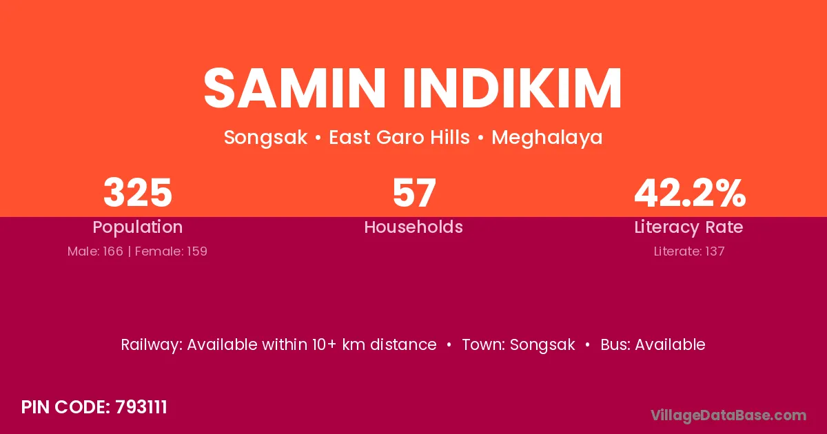 The literacy rate of Samin Indikim village is 42.15%. Male literacy stands at 49.40% and female literacy at 34.59%.
