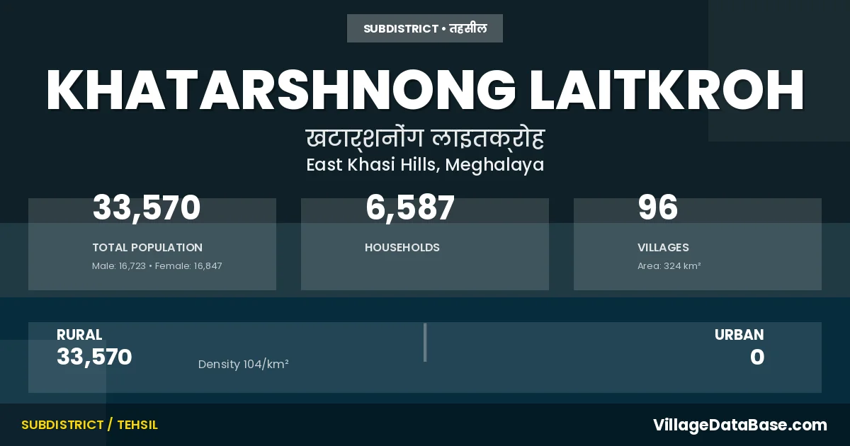According to the 2011 census The total area of Khatarshnong Laitkroh Subdivision is 324 km², with a population of 33570 people. The population density is 104 inhabitants per square kilometre, and there are approximately 6587 houses in the sub district.