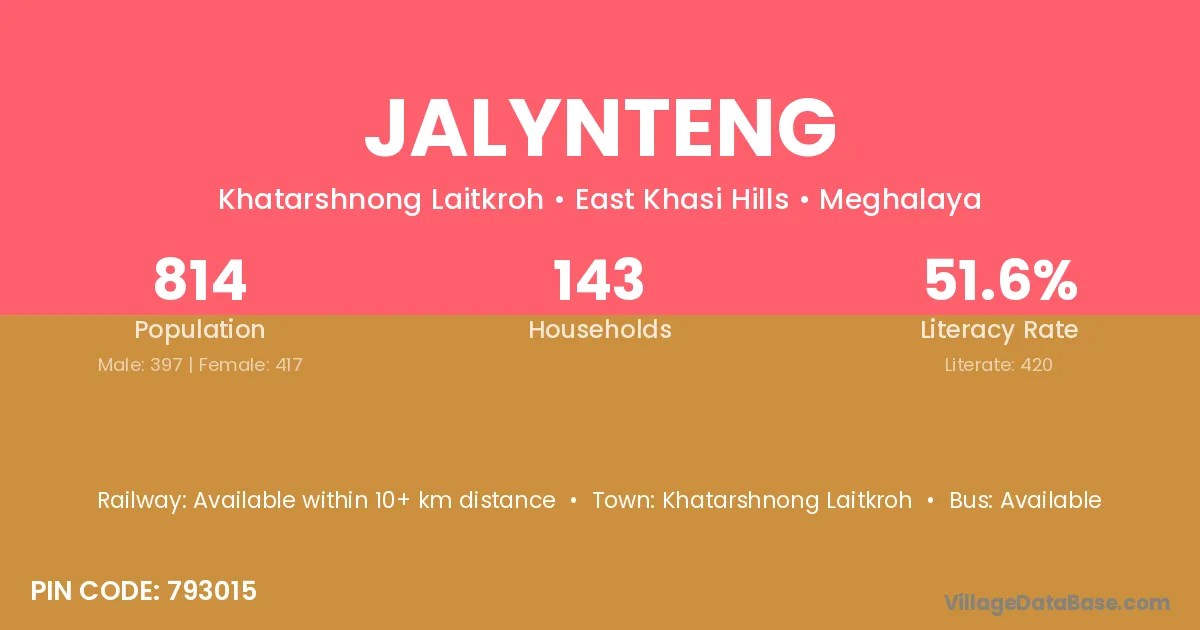 Jalynteng village has a total population of 814 people, of which 397 are males and 417 are females.