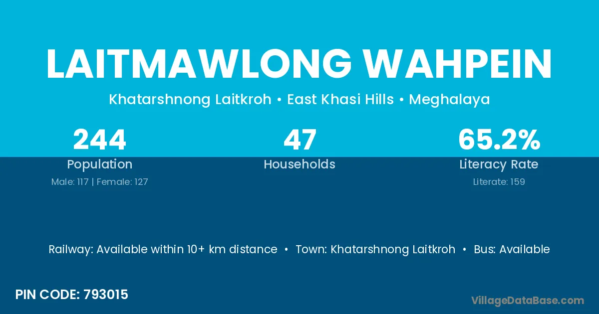Laitmawlong Wahpein village has a total population of 244 people, of which 117 are males and 127 are females.
