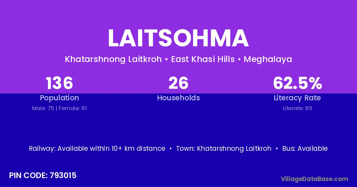Laitsohma village has a total population of 136 people, of which 75 are males and 61 are females.