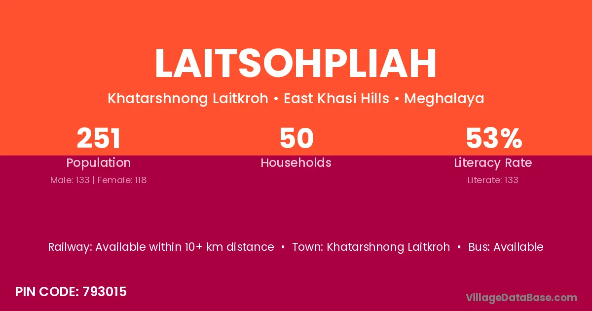 Laitsohpliah village has a total population of 251 people, of which 133 are males and 118 are females.