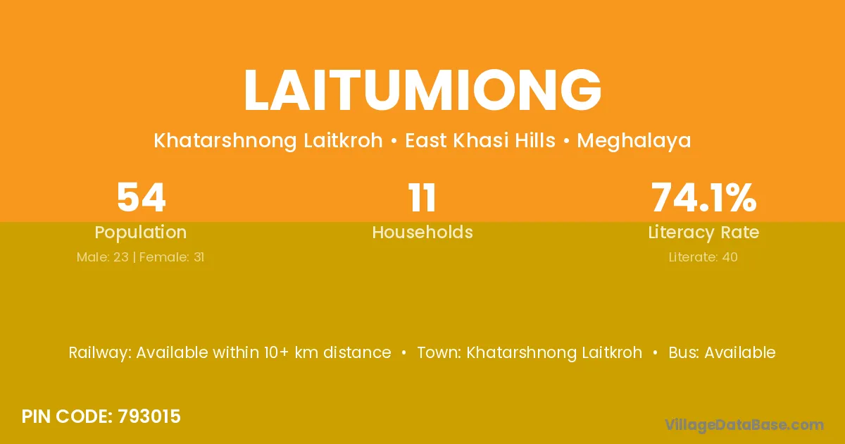 Laitumiong village has a total population of 54 people, of which 23 are males and 31 are females.