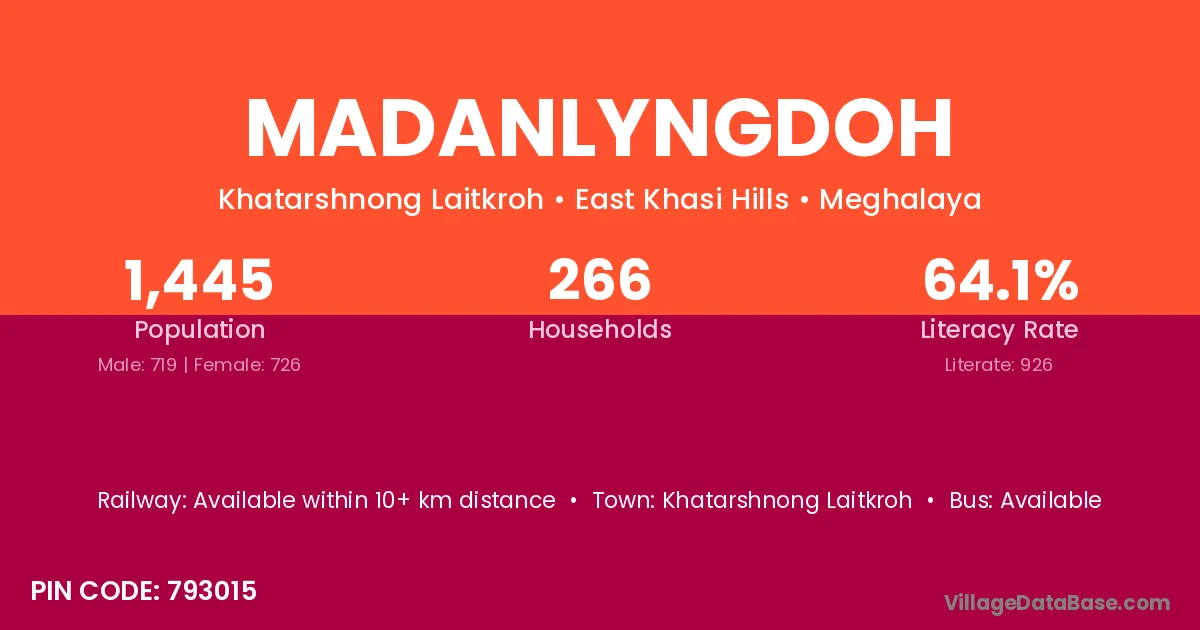 Madanlyngdoh village has a total population of 1,445 people, of which 719 are males and 726 are females.