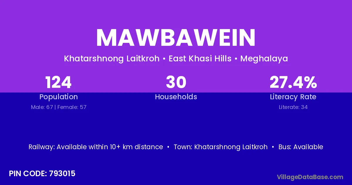 Mawbawein village has a total population of 124 people, of which 67 are males and 57 are females.