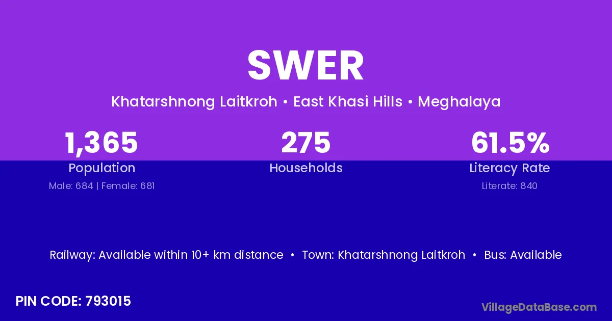 Swer village has a total population of 1,365 people, of which 684 are males and 681 are females.