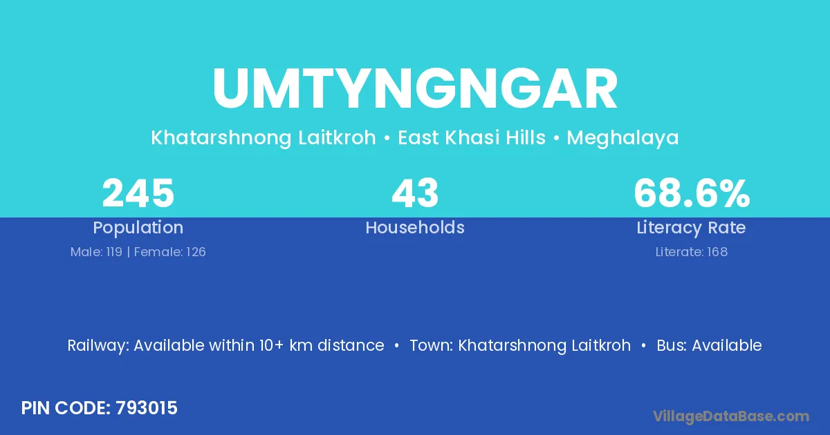 Umtyngngar village has a total population of 245 people, of which 119 are males and 126 are females.