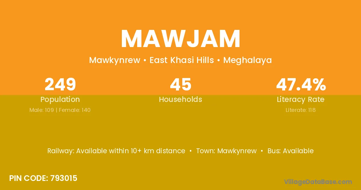 The literacy rate of Mawjam village is 47.39%. Male literacy stands at 40.37% and female literacy at 52.86%.