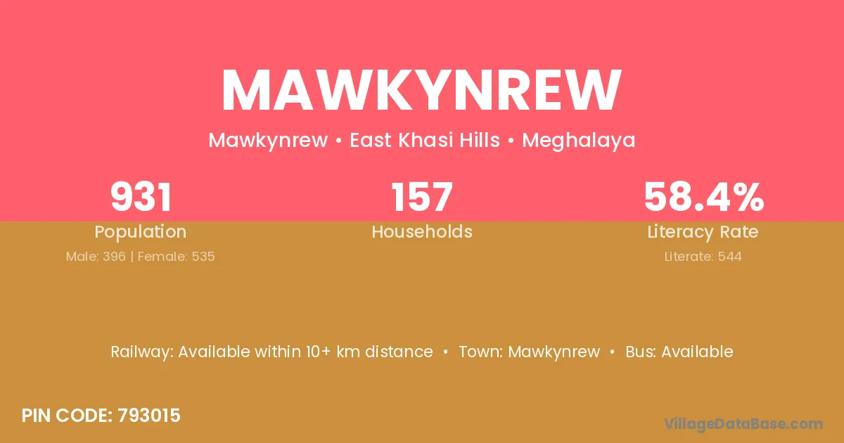 Mawkynrew village has a total population of 931 people, of which 396 are males and 535 are females.