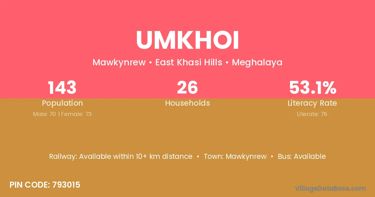 Umkhoi village has a total population of 143 people, of which 70 are males and 73 are females.