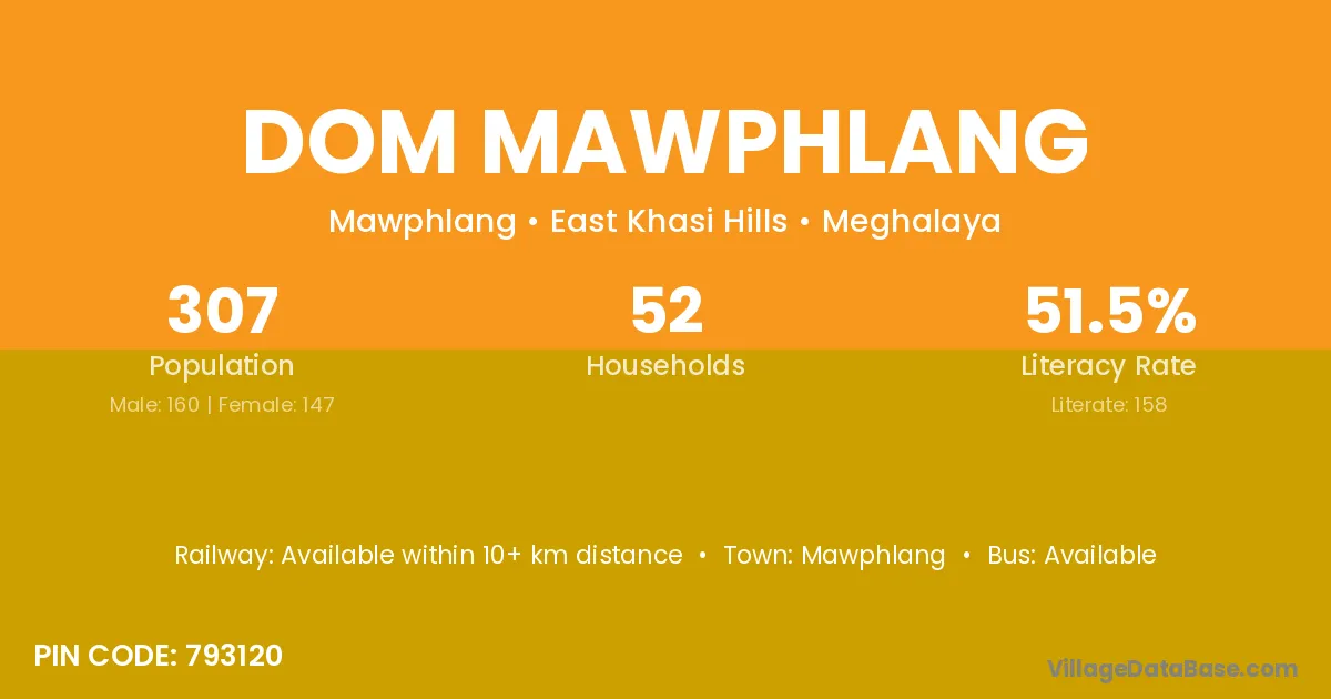 Dom Mawphlang village has a total population of 307 people, of which 160 are males and 147 are females.