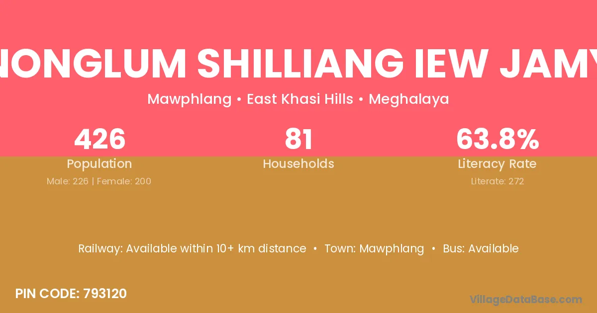 Krang Nonglum Shilliang Iew Jamynthlen village has a total population of 426 people, of which 226 are males and 200 are females.